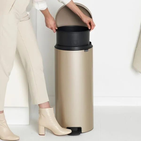 Brabantia Treteimer NewIcon 30L mit Kunststoffeinsatz in Metallic Gold. Die newIcon-Treteimer von Brabantia sind nicht nur legendäre Schönheiten, sondern gleichzeitig besonders nachhaltig und vor allem zuverlässig. Und selbstverständlich sind die newIcon-Treteimer geruchsdicht, lassen sich einfach ö