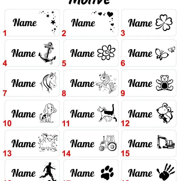 | Motiv | Herzen, Sterne, Kleeblatt, Blume, Anker, Schmetterlinge, Traktor, Bagger, Schwein, Hund, Katze, Maus, Pferd, Einhorn, Teddybär, Fußball, Pfotenabdruck, Handabdruck, OHNE |