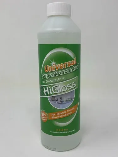 HiGloss Superkonzentrat ist ein Universalreiniger für den täglichen Gebrauch im Haushalt, Auto, Boot, Caravan und sowie auch für die Industrie. Ideal auch für Autoaufbereiter, Glas und Oberflächen Reinigung, auch als Tapetenablöser. HiGloss Super-Konzentrat ist geruchlos, farblos, nicht ätzend und b