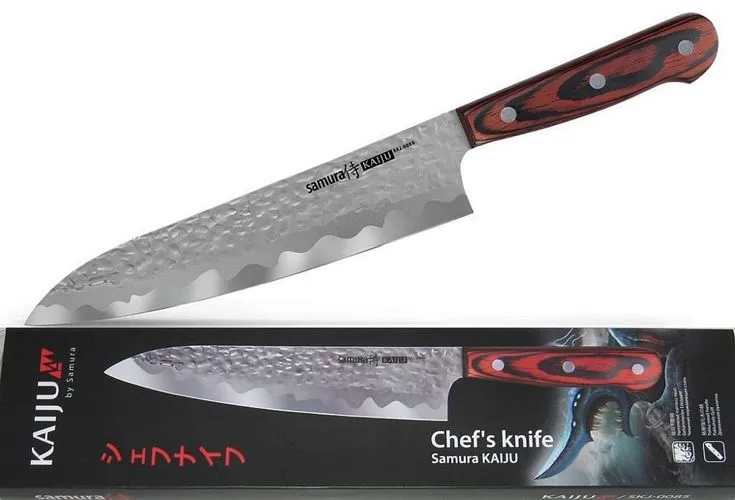 KAIJU by samura – Hersteller hochwertiger Kochmesser im ASIA Style und Design – hier das Chef´s Knife – Kochmesser – Gesamtlänge: 33,5 cm – Gewicht: 195 g – Griffmaterial: Pakkaholz – Klingenlänge: 21 cm – Klingenstahl: Hammered Stainless Steel Neuware, unbenutzt in der OVP – Lieferung ab Lage